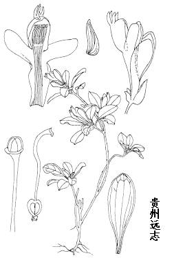 贵州远志是多年生草本或矮小亚灌木。高5-10cm,茎圆柱形,具白色短柔毛。叶互生;叶柄长约6mm,略具翅;叶纸质,椭圆状倒披针形至匙形,长1-1.5cm,宽5-8mm,先端钝,具短尖头,基部楔形并下延,上面绿色,边缘被白色短刚毛,下面淡绿色,稍粗糙,全缘,主脉在上面微凹,下面突起,侧脉2-3对。总状花序顶生,极短,具数花;花大,白色或淡绿白色,长1.2-1.5cm,被白色短柔毛;萼片5,花后脱落,外萼片3枚小,中间1枚兜状,内萼片2枚大,花瓣状,基部具爪;花瓣3,龙骨瓣长约1.2mm,顶端背部有4枚线状鸡冠状附属物,侧生花瓣2/3以下与龙骨瓣合生;雄蕊8,花丝3/4以下合生成鞘,并与花瓣贴生,花药顶孔开裂,有药隔;子房具翅,基部具短柄及环状花盘,柱头2裂,上裂片小,下裂片大,柱头生裂片内。果实未见。