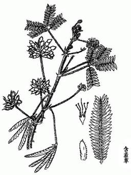 含羞草是披散半灌木状草本,高可达1m。有散生、下弯的钩刺及倒生刚毛。叶对生,羽片通常4,指状排列于总叶柄之顶端;叶柄长1.5-4cm;托叶披针形,长5-10mm,有刚毛。小叶10-20对,触之即闭合而下垂;小叶片线状长圆形,长8-13mm,先端急尖,基部近圆形,略偏斜,边缘有疏生刚毛。头状花序具长梗,单生或2-3个生于叶腋,直径约1cm;花小,淡红色;苞片线形,边缘有刚毛;萼漏斗状,极小,短齿裂;花冠钟形,上部4裂,裂片三角形,外面有短柔毛;雄蕊4,基部合生,伸出花瓣外;子房有短柄,无毛,花柱丝状,柱头小。荚果扁平弯曲,长约14mm,先端有喙,有3-4节,每节有1颗种子,荚缘波状,具刺毛,成熟时荚节脱落。种子阔卵形。花期3-4月,果期5-11月。