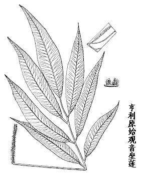 亨利原始观音坐莲是陆生中型蕨类植物。具肉质近直立的根状茎,直径2-3cm根肉质而长,粗壮,除顶端略有鳞片外,其余均光滑。叶簇生;叶柄长40-60cm,粗约2.5mm,有宿存的棕色或深棕色狭披针形鳞片;叶一回羽状,草质,有羽片2-4对,先端1枚同形而较大,长可达30cm,宽达6.5cm;侧生羽片互生,有柄,彼此分开约5-6cm,斜出,基部1对稍短,长12-15cm,宽约3cm,上面1对长约17-20cm,宽4-5cm,宽披针形,全缘或略为波状;羽柄长约1cm,膨大,有鳞片。叶脉细而疏生,多分叉或分叉脉与单脉相间。孢子囊群线形,长10-20mm,被等宽的间隙分开,由60-160个孢子囊组成,位于中肋与叶边之间,密生长过于孢子囊群的红褐色节状分叉夹丝。
