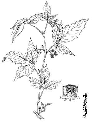 库页悬钩子是小灌木,高0.6-2m。枝紫褐色,小枝具柔毛,被较密黄色、棕色或紫红色直立针刺,并混生腺毛。复叶;叶柄长2-5cm,顶生小叶柄长1-2cm,侧生小叶几无柄,均具柔毛、针刺或腺毛;托叶腺形;小叶常3枚,不孕枝上有时具5小叶,叶片卵状披针形或长圆状卵形,长3-7cm,宽1.5-4(-5)cm,先端急尖,顶生小叶先端常渐尖,基部圆形,顶生小叶基部有时浅心形,下面密被灰白色绒毛,边缘有不规则粗锯齿或缺刻状锯齿。花白色,5-9朵成伞房花序,顶生或腋生;花梗长1-2cm;花直径约1cm;花萼外面密被短柔毛,具针刺和腺毛;花瓣舌状或匙形,短于萼片;花丝与花柱等长;花柱基部和子房具绒毛。果实卵圆形,直径约1cm,红色。花期6-7月,果期8-9月。
