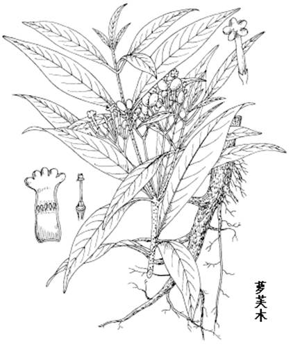化合物成分:利血平(reserpine),育亨宾(yohimbine),萝莱碱(raunescine),四氢蛇根碱(ajmalicine),蛇根亭碱(serpentinine),萝芙木碱(ajmaline),萝芙木甲素(rauwolfia A),山马蹄碱(samatine),魏氏波瑞木胺(碱)(vellosimine),霹雳萝芙辛碱(peraksine),熊果酸(ursolic acid),斯配加春(spegatrine),萝芙木亭碱(verticillatine),双斯配加春(dispegatrine),大斯配加春(macrospegatrine),萨杷晋碱(sarpagine),异利血平灵(isoreserpiline),霹雳萝芙木碱(perakine),佩立任碱(pelirine),蛇根定碱(seredine),利血胺(rescinnamine),利血平-4-氧化物(renoxidine),四氢鸭脚木碱(tetrahydroalstonine),马蹄叶碱(aricine),利血平宁(reserpinine),利血平灵(reserpiline),香鹰爪花碱(suaveoline),卡拉帕洛宾碱(carapanaubine),卡拉帕洛宾碱Nb-氧化物(carapanaubine-Nb-oxide),萝芙木星(rauvoxine),异利血平灵-ψ-吲哚酚(isoreserpiline-ψ-indoxyl)等。