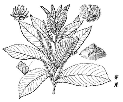 茅栗是落叶灌木或小乔木。幼枝被柔毛,芽卵形,长2-3mm。叶互生;叶柄长0.6-1cm,有短毛;叶片薄革质,长椭圆形或倒卵状长椭圆形,长6-14cm,宽3-7cm,先端渐尖,基部楔形、圆钝或略近心形,常一侧偏斜,边缘具短刺状小锯齿,羽状侧脉12-17对,上面光亮,脉上有毛,下面褐黄色,具鳞状腺点。花单性,雌雄同株;雄花序穗状,单生于新枝叶腋,直立,长6-7cm,单被花,雄蕊10-14;雌花生于雄花序下部,通常三花聚生,子房下位,6室。总苞近球形,直径3-4cm,外面生细长尖刺,刺长4-5.5mm,密生,每壳斗有3-7个坚果,常为3个;坚果扁球形,直径1-1.5cm,褐色。花期5月,果期9-10月。