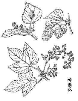 化合物成分:葎草酮(humulone),类葎草酮(cohumulone),伴葎草酮(adhumulone),蛇麻酮(lupulone),类蛇麻酮(colupulone),伴蛇麻酮(adlupulone),异葎草酮(isohumulone)A,B,原花色素(proanthocyanidin),前葎草酮(prehumulone),葎草二烯酮(humuladienone),葎草烯酮-Ⅱ(humulenone-Ⅱ),α-去二氢荜澄茄烯(α-corocalene),γ-去二氢菖蒲烯(γ-calacorene),2-甲基-3-丁烯-2-醇(2-methylbut-3-en-2-ol),紫云英甙(astragalin),异槲皮甙(isoquercitrin),芸香甙(rutin),山柰酚-3-鼠李糖基二葡萄糖甙(kaempferol-3-rhamnodiglucoside),山柰酚-3-鼠李糖葡萄糖甙(kaempferol-3-rhamnoglucoside),槲皮素-3-鼠李糖二葡萄糖甙(quercetin-3-rhamnodiglucoside),槲皮素-3-葡萄糖甙(quercetin-3-glucoside),山柰酚葡萄糖甙(kaempferolglucoside),无色矢车菊素(leucocyanidin),无色飞燕草素(leucodelphinidin),山柰酚(kaempferol),槲皮素(quercetin),异黄腐醇(isoxanthohumol),黄腐醇(xanthohumol),3′-(异戊二烯基)-2′,4-二羟基-4′,6′-二甲氧基查耳酮[3′-(isoprenyl)-2′,4-dihydroxy-4′,6′-dimethoxychalcone],2′,6′-二甲氧基-4,4′-二羟基查耳酮(2′,6′-dimethoxy-4,4′-dihydroxychalcone),6-异戊烯基柚皮素(6-isopentenylnaringenin),抗坏血酸(ascorbicacid),去氢抗坏血酸(dehydroascorbicacid)等。