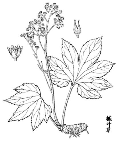 槭叶草是多年生草本,高10-30cm。地下茎粗壮,有褐色鳞片。基生叶1-2片,无毛;叶柄长5-18cm;叶片卵圆形,掌状5-7浅裂或深裂,裂片卵状披针形,先端渐尖或急尖,基部心形或楔形,边缘有锯齿;花葶疏生柔毛。复伞形花序,长5-7cm,密生短腺毛和微柔毛;花梗长2-4mm;花萼钟状,白色,长5-6mm,有5-6深裂,裂片狭卵形,先端钝;花瓣5-6,披针形,白色,较萼片短;雄蕊5-6,长约2mm,花药近球形;心皮2,合生至中部,子房半下位。蒴果。种子多数。花期5-6月,果期6-7月。