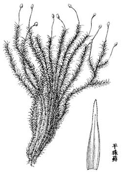 平珠藓的植物体密集丛生,黄绿色,基部被黄褐色茸毛状假根,茎高5-6cm,横切面呈三棱形。叶密生,倾立至背仰,阔或狭披针形,渐尖,先端内褶,上部叶缘具双列重锯齿,下部平滑,背卷;中肋粗壮,上部具齿;叶细胞方形或长方形,上部叶边较短,基部的较长,细胞平滑,无乳头。蒴柄橙红色;孢蒴直立,球形略凸背,倾立如珠,老后干缩有纵条纹,橙红色,显眼而艳丽。
