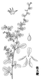 铁马鞭是半灌木,高60-80cm。茎枝均细长,常平卧地面,全株密被长粗毛。三出复叶,互生;叶柄长0.5-2cm;叶片广椭圆形至广倒卵形,长1-2cm,宽0.8-1.2cm,先端圆或截形,有短尖,常内凹,基部近圆形,全缘,两面均密被淡黄色长粗毛。总状花序腋生,花梗短,每花序着生3-5朵花;小苞片披针形,具淡黄色长粗毛;花萼深5裂,裂片披针形,外被长毛;蝶形花冠,黄白色,旗瓣倒卵形,基部带紫纹,先端微凹,翼瓣、龙骨瓣基部均具爪;雄蕊10,二体;子房有毛。荚果卵圆形,扁平,径约3mm,先端具细尖,表面有白色长毛。种子肾圆形,光滑无毛。花期6-9月,果期10-11月。