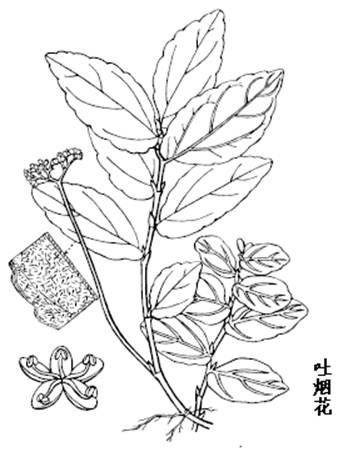 吐烟花是一年生草本。茎肉质,分枝,匍匐,节下生根。叶肉质,在同一节上有两种叶,退化叶极细小,几无柄,线状倒卵形,正常叶较大;叶柄长2-10mm,密被短柔毛;托叶膜质,卵状披针形,长4-8mm,2枚合生,宿存;叶片近圆形、椭圆形或卵形,长2-6.5cm,宽1.3-3cm,先端钝或圆形,有时急尖,基部心形,极不对称,边缘波状或有波状圆齿,有时近全缘,上面深绿色,下面淡绿色,有线状钟乳体条纹,背面在叶脉上密被柔毛;两侧基出脉达叶片中部,粗大,中脉每边有侧脉2-4条;雌雄异株,花序腋生;雄花序为疏散的聚伞花序,有长5-8cm的总花梗;雌花序为密伞花序,近无总花梗;雄花萼裂片5,长1.5-2mm,同大;雌花萼裂片5,长圆形,长约1mm,近相等,顶端有小尖头,雌蕊5;子房小于花萼,有小瘤体。瘦果淡棕色,有明显的硬瘤体。花期5-10月。