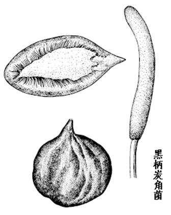 黑柄炭角菌的菌丝体白色,直径8-14μm,交织成网状,密布于废弃的黑翅土白蚁菌圃腔内。成熟时,部分菌丝集结形成菌核。菌核球形、椭圆球形或卵形,故有“鸡[土+从]蛋”之称。外表褐色或黑色,直径1.5-8cm,与菌丝连接处有圆形凹窝,菌核长成后逐渐与菌丝脱离联系,呈“肚脐”状。菌核内部白色,肉质绵软,有类似鸡[土+从]菌的香气。味甘甜。菌核上端有柄悬着于白蚁穴上壁,并与假根相连。假根圆柱形或扁圆柱形,直径2-3mm,外表黑色,内部白色,常有分枝,曲折蔓延生长于泥土中。其上与子座柄部相连,子座散生或群生于地面,多单枝,偶有从柄部分枝者,呈圆柱形,连柄高4-18cm,柄长1-6cm,直径2-5mm,外表黑色,内部灰白色,中心黑色。子座棍棒状,长3-12cm,直径2.5-7mm,中部稍粗,顶端圆钝,初生时灰白色,后变为褐色,外表有疣状突起的子囊盖,子囊壳椭圆形,埋于子座外层,子囊盖外突,疣状孔口黑色,子囊孢子众多,类球形,熟时黑褐色,侧丝单根或分枝。