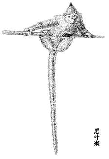 黑叶的体形纤瘦,长约50cm。雄性较大。四肢细长,手脚狭而长,头小,臀胝小,尾甚长,一般为体长的1.5倍。头顶有一小撮直立的黑色冠毛;颜面瘦削,不具颊囊;体毛黑色且较长,稍有光泽。自耳下经两颊到口角,各有一道白毛,长尾尾端显乳白色。