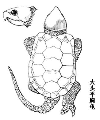 大头平胸龟的背甲长65-156mm,宽55-113mm,壳高34-57mm。头大,颈短,不能缩入壳内,头背覆以大块角质盾片,颌粗大,显著钩曲呈鹰嘴状,背甲长椭圆形,前缘中部凹入,脊部扁平,有一纵棱,颈盾极短小而宽,腹甲略近长方形,前缘平切,后缘凹入;具下缘盾。指、趾端具蹼,有爪。股后及肛侧有锥状鳞,尾甚长,具呈环状排列的长方形鳞片。背面棕黑色,多有浅橘黄色细点,椎盾有辐射状黑纹,每一肋盾有一小黑斑,腹甲橄榄绿,幼体脊棱明显,缘盾第8枚起呈锯齿状,背甲灰绿、棕褐或红棕,腹面橘红色。