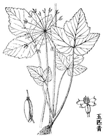 五匹青是多年生草本,高25-50cm。根茎有节,粗糙,细圆锥形,肉质。茎单生,或2-3,管状,中空,疏生短毛。基生叶叶柄长10-20cm,基部有宽膜质叶鞘;叶片轮廓三角状卵形,长3-7.5cm,一至二回三出分裂,裂片纸质,卵形或长卵形,长2-5.5cm,宽2-5cm,常2-3裂,基部楔形或截形,全缘,先端短尖,沿叶脉和叶缘有粗伏毛;茎生叶与基生叶同形,有短柄或无柄。复伞形花序;无总苞片;伞辐15-30,近丝状;小总苞片1-4,线状披针形,大小不等;小伞形花序有花2-5;萼齿大小不等;花瓣白色至淡紫色,长圆形至倒卵形;花柱基圆锥形,花柱直立。双悬果长卵形,基部宽而圆钝,长3-5mm,宽2-3mm,果棱有丝状细齿,每棱槽内有油管1-3。花、果期4-7月。