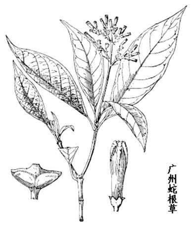 广州蛇根草属直立、多分枝草本,高40-80cm。枝四棱柱形,无毛。叶对生,膜质;叶柄长1.5-4cm;托叶早落;叶片长圆形或长圆状披针形,长8-15cm,宽3-5cm,先端钝渐尖,基部楔尖,干后上面墨绿色,下面淡黄色,侧脉每边10-12条,柔弱而明显。聚伞花序成圆锥花序式排列,顶生,被锈色粉末状柔毛;苞片及小苞片条形,被锈色粉末状柔毛,宿存;花5数,大部偏生于分枝的1侧;花具短梗;花萼被粉状柔毛,萼筒近球形,裂片三角形;花冠白色,长1.5cm,上部稍膨大而有膜质的翅,裂片长圆形,稍钝,直立;雄蕊内藏。蒴果菱形,宽为长的3倍,约9mm,略被短毛。花期秋季。