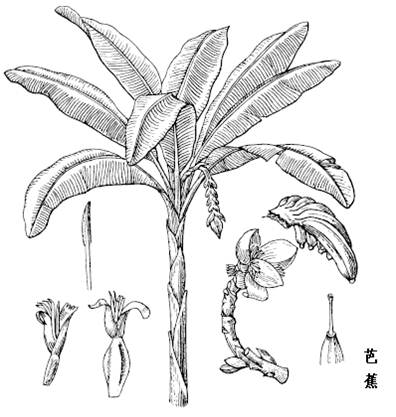 芭蕉是多年生丛生草本,高2.5-4m。叶柄粗壮,长达30cm;叶片长圆形,长2-3m,宽25-30cm,先端钝,基部圆形或不对称,叶面鲜绿色,有光泽。花序顶生,下垂;苞片红褐色或紫色;雄花生于花序上部,雌花生于花序下部;雌花在每一苞片内10-16朵,2列;合生花被片长4-4.5cm,具5(3+2)齿裂,离生花被片几与合生花被片等长,先端具小尖头。浆果三棱状,长圆形,长5-7cm,具3-5棱,近无柄,肉质,内具多数种子。种子黑色,具疣突及不规则棱角,宽6-8mm。花期8-9月。
