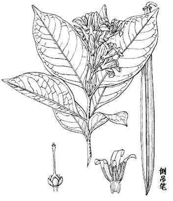 倒吊笔属乔木,高8-20m。全株具乳汁;树皮黄灰褐色,浅裂;枝条密生皮孔,嫩枝被黄色柔毛,老枝无毛。叶对生;叶柄长0.4-1cm;叶片坚纸质,卵状长圆形或长圆状披针形,长5-10cm,宽3-6cm,先端短渐尖,基部急尖至钝,叶面微被柔毛,叶背密被柔毛;侧脉每边8-15条。聚伞花序顶生;花萼5裂,裂片宽卵形,比花冠筒短,内面基部有腺体;花冠白色、浅黄色或粉色,漏斗状,裂片5,长圆形;副花冠分裂为10鳞片,呈流苏状,比花药长或等长,其中5枚鳞片生于花冠裂片上,先端通常有3个小齿,其余5个鳞片生于花冠筒先端,先端2深裂;雄蕊5,花药伸出花冠喉部之外,花药箭头状,被短柔毛;子房由2枚粘生心皮组成,无毛,花柱丝状,向上逐渐增大,柱头卵形。蓇葖2个粘生,线状披针形,灰褐色,斑点不明显,长15-30cm,直径1-2cm。种子线状纺锤形,黄褐色,先端具淡黄色绢质种毛,种毛长2-3.5cm。花期4-8月,果期8月至翌年2月。 |