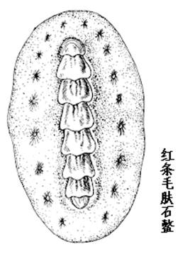 1 、红条毛肤石鳖的体卵圆形,长27-33mm,宽16-21mm。体色变化大,多为灰绿色或青灰色。背腹扁平,头在前下方,无眼及触角,有一短而下弯的吻,吻中为口,口内齿舌很长。背面中央突起,有呈覆瓦状排列的石灰质壳片8块,暗绿色壳片中央具有3条红色色带。前端头壳片呈半圆形,壳顶部较光滑,边缘部分有低平粒状突起,腹面前方的嵌入片有齿裂5个。近两端的壳片长宽略相近,中间的壳片略宽,峰部有纵肋,翼部有较大的颗粒状突起,嵌入片的翼部位置具1个齿裂。尾壳片较小,前缘中央微凹,后缘弧形,表面有颗粒状突起,嵌入后区两侧各具1齿裂。在壳片的四周围有一圈外套膜,形成较宽的环带,呈深绿色,其周围相间布有18丛棘束。腹面平坦,足扁而宽,几占整个腹面。足与外套膜之间形成一较狭的外套沟。沟中有鳃22-24对。鳃列长约为足长的2/3。生殖孔和排泄孔位于外套沟稍后端。肛门位于足的后方。