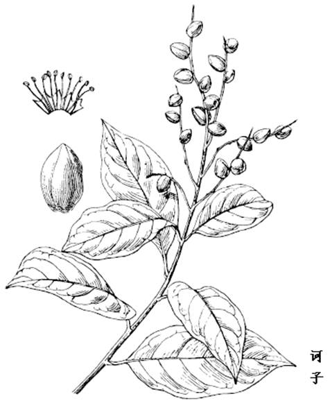 诃子属乔木,高达30m。枝近无毛,皮孔细长,白色或淡黄色,幼枝黄褐色,被绒毛。叶互生或近对生;叶柄粗壮,长1.8-2.3cm,距顶端1-5mm处有2(-4)腺体;叶往卵形或椭圆形,长7-14cm,宽4.5-8.5cm,先端短尖,基部钝圆或楔形,偏斜,全缘或微波状,两面无毛,密被细瘤点;穗状花序腋生或顶生,有时又组成圆锥花序;花两性;花萼管杯状,淡绿带黄色,长约3.5mm,5齿裂,长约1mm,三角形,外面无毛,内面被黄棕色的柔毛;花瓣缺;雄蕊10,高出花萼之上,花药小,椭圆形;子房下位,1室,圆柱形,长约1mm,被毛,干时变黑褐色,花柱长而粗,锥尖。核果,卵形或椭圆形,长2.4-4.5cm,径1.9-2.3cm,青色,粗糙,无毛,成熟时变黑褐色,通常有5条钝棱。花期5月,果期7-9月。 |