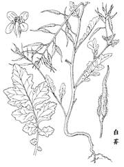 白芥是一年生或二年生粗壮草本,高40-120cm。茎直立,具纵棱,上部多分枝,被散生白色硬毛。叶互生。质薄,具柄;茎基部叶片大头羽状裂或近全裂,宽椭圆形或卵圆形,长6-15cm,宽2-3cm,顶裂片大。有侧裂片l-3对,边缘具疏齿;茎生叶较小,具短柄,向上裂片数渐少。总状花序顶生或腋生;萼片4,绿色,直立,披针形或长圆形.基部具爪;雄蕊6,4长2短,长雄蕊长8.5-9.5mm,短雄蕊长6-6.5mm;雌蕊l,子房长柱形,长9-10mm,密被白色长刺毛。长角果圆柱形长2-2.5cm,密被白色硬刺毛,果瓣在种子间缢缩成念珠状,角果先端具扁平剑形的喙。种子近球形,淡黄色。花期4-6月,果期5-7月。