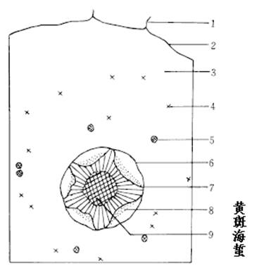 2、黄斑海蜇的成体一般为乳白色,外伞表面具黄褐色斑点。伞径达21-45cm,最大可达54cm左右,伞中央胶质厚,边缘渐薄。外伞表面粗糙,具众多小而尖锥形的黄褐色突起(这是与前种的显著区别)。伞缘每1/8有8个长椭圆形缘瓣。内伞4个间辐处各有1个生殖腺,其下腔生殖乳突很大,呈卵圆形,表面具尖刺状突起。口腕8个,三翼型,具多数短棒状附属物,其末端膨大呈球状。腕端及腕上附属物呈黄褐色,口腕及生殖腺皱褶呈乳黄白色。
