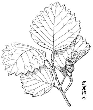 辽东桤木属落叶乔木,高6-20m。树皮灰褐色,光滑;枝条暗灰色,有棱;小枝褐色,密生灰色柔毛;芽有柄,芽鳞2枚,有毛。叶柄长1.5-5.5cm;叶片近圆形,稀卵形,长4-9cm,宽2.5-9cm,先端圆形,稀锐尖,基部圆形或宽楔形,边缘有波状缺刻,或为粗重锯齿,上面疏生毛,下面粉绿色,密生褐色毛或无毛,有时脉腋间簇生髯毛;侧脉5-10对,直伸齿端。花单性,雌雄同株;果序2-8枚呈总状或圆锥状排列,果序梗极短,长2-3mm或几无梗;果苞木质,先端微圆,有5枚浅裂片;小坚果宽卵形,长约3mm;果翅厚纸质,极狭,宽为果的1/4。花期5月,果期8-9月。