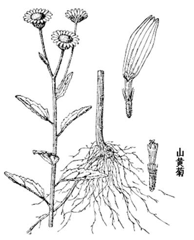 山黄菊属一年生草本,高40-100cm。根粗壮,径5-12mm。茎直立,单生,稀簇生,有细条纹,密被锈色柔毛。中部茎叶卵状披针形或狭长圆形,长3-6cm,宽1-2cm,两面被柔毛,沿脉毛较密,基部截形或宽楔形,边缘有钝锯齿,三出脉或离基三出脉,向上叶渐小。头状花序单生或数个排列成顶生伞房状;总花梗被锈色密柔毛;总苞半球形;总苞片3层,披针形或宽条形,外面密被伏柔毛;托片龙骨状,膜质,长5mm;雌花舌状,黄色,舌片倒长三角形,先端3齿裂;两性花筒状,先端5齿裂。瘦果圆柱形,疏被柔毛,雌花瘦果长2mm,两性花瘦果稍压扁,有4纵肋;冠毛污白色,膜片状,4-5个,先端有伸长1mm的细芒。花、果期8-11月。