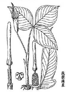 浅裂南星属多年生草本。块茎近球形,直径约4cm。鳞叶线状披针形,最上的长12-15cm,先端锐尖或钝。叶1或2,叶柄长17-35cm,下部具鞘,黄绿色,有紫色斑块,形如花蛇;叶片3全裂,中裂片长圆形或椭圆形,基部狭楔形或钝,长8-22cm,宽4-10cm,具1.5-5cm的长柄;侧裂片无柄,不对称,长圆形,外侧宽为内侧的2倍,下部1/3具宽耳,长5-23cm,宽2-8cm;侧脉脉距约1cm,集合脉距边缘5mm。花序柄长较叶柄为短;佛焰苞外面淡紫色,管部漏斗状,喉部无耳,斜截形,骤狭为檐部;檐部披针形,狭渐尖,有时具长2-3cm的尾尖,深紫色或绿色,下弯或垂立。肉穗花序单性;雄花序花疏,雄花具短柄,花药2-3,药室青紫色,顶孔纵裂;雌花序圆柱形或近球形;各附属器具长约6mm的细柄,先端钝圆,直立。浆果,有种子3颗。花期4-7月,果期8-9月。 |