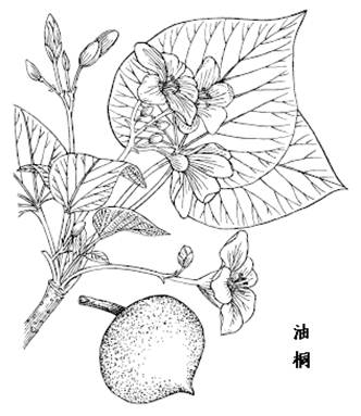 油桐属落叶小乔木,高达9m。枝粗壮,无毛,皮孔灰色。单叶互生;叶柄长达12cm,顶端有2红紫色腺体;叶片革质,卵状心形,长5-15cm,宽3-14cm,先端渐尖,基部心形或楔形,全缘,有时3浅裂,幼叶被锈色短柔毛,后近于无毛,绿色有光泽。花先叶开放,排列于枝端成短圆锥花序;单性,雌雄同株;萼不规则,2-3裂;花瓣5,白色,基部具橙红色的斑点与条纹;雄花具雄蕊8-20,排列成2轮,上端分离,且在花芽中弯曲;雌花子房3-5室,每室1胚珠,花柱2裂。核果近球形,直径3-6cm。种子具厚壳状种皮。花期4-5月,果期10月。