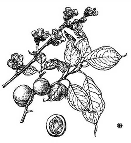 梅属落叶乔木,高达10米。树皮灰棕色,小枝细长,先端刺状。单叶互生;叶柄长1.5cm,被短柔毛;托叶早落;叶片椭圆状宽卵形,春季先叶开花,有香气,1-3朵簇生于二年生侧枝叶腋。花梗短;花萼通常红褐色,但有些品种花萼为绿色或绿紫色;花瓣5白色或淡红色,直径约1.5cm,宽倒卵形;雄蕊多数。果实近球形,直径2-3cm,黄色或绿白色,被柔毛;核椭圆形,先端有小突尖,腹面和背棱上的沟槽,表面具蜂窝状孔穴。花期春季,果期5-6月。