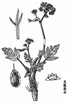 美脉藁本属多年生草本,高15-40cm。基部密被纤维状枯萎叶鞘。根长约15cm,径约1cm。多分叉。茎自基部分枝。基生叶叶柄长2-4cm,基部扩大成鞘;叶片轮廓长卵形至卵形,长4-8cm,宽2.5-6cm,羽状分裂,羽片2-3对,基部羽片边缘具浅锯齿,顶端羽片长圆状披针形,长3-5cm,宽1.5-2cm,边缘具齿至深裂;茎上部叶极少,叶柄渐短至无柄。复伞形花序直径3-4cm;总苞片少数,羽状分裂,早落;伞辐不等长;小总苞片4-8,羽状分裂或为三叉状,边缘具睫毛;萼齿1-2;花瓣白色,基部具短爪;花丝白色,花药堇青色;花柱基隆起。分生果背腹面扁压,卵形,长约3mm,宽约2mm,背棱槽内油管1-2,侧棱槽内油管2,合生面油管6。花期6-8月,果期9月。