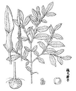 2、疏毛磨芋与磨芋的区别是:附属器多少被毛,散生长约10mm的紫色硬毛;佛焰苞檐部卵状长圆形,边缘波状,外面淡绿色,具白色斑块;子房球形,花柱缺,柱头2浅裂,子房2室。浆果红色,后变蓝色。花期5月。