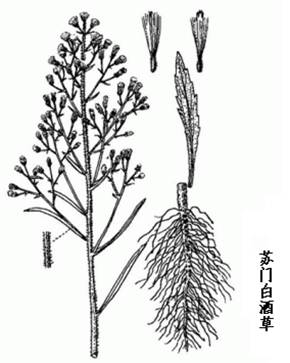 苏门白酒草属一年或二年生草本,高80-150cm。根纺锤状,直或弯曲。茎直立,粗壮,具棱条,绿色或下部红紫色,中部或中部以上有长分枝,被较密灰白色上弯的糙短毛,杂有开展的疏柔毛。叶密集,基部叶花期凋落,下部叶倒披针形或披针形,长6-10cm,宽1-3cm,先端尖或渐尖,基部渐狭成柄,边缘上部每边常有4-8个粗齿,基部全缘,中部和上部叶渐小,狭披针形或近线形,具齿或全缘,两面尤其是下面被密糙短毛。头状花序多数,径5-8mm,在茎枝端排成大而长的圆锥花序,梗长3-5mm;总苞卵形短圆柱状,长约4mm,宽3-4mm;总苞片3层,灰绿色,线状披针形或线形,先端渐尖,背面被短糙毛,外层稍短或短于内层之半,边缘干膜质;花托具明显小窝孔;雌花多层,长4-4.5mm,管部细长,舌片淡黄色或淡紫色,极短细,丝状,先端2细裂;两性花6-11个,花冠淡黄色,长约4mm,檐部狭漏斗形,上端具5齿裂,管部上部被疏柔毛。瘦果线状披针形,长1.2-1.5mm,压扁,被贴微毛;冠毛1层,初时白色,后变黄褐色。花期5-10月。