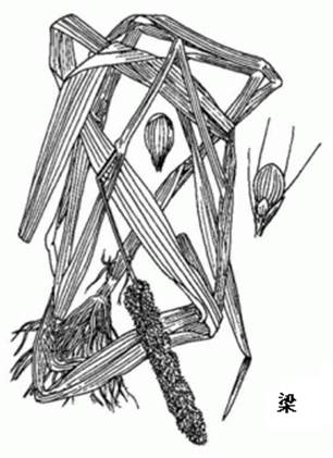 1、粱属一年生栽培作物,须根粗大。秆粗装,直立,高0.1-1m。叶鞘松裹茎秆,密具疣毛或无毛,毛以近边缘及叶片交接处的背面为密,边缘密具纤毛;叶舌为1圈纤毛;叶片长披针形或线状披针形,长10-45cm,宽5-33mm,先端尖,基部钝圆,上面粗糙,下面稍光滑。圆锥花序呈圆柱状或近纺锤状,通常下垂,基部多少有间断,长10-40cm,宽1-5cm,常因品种的不同而变异,主轴密被柔毛,刚毛显着长于或稍长于小穗,黄色,褐色或紫色;小穗椭圆形或近圆球形,长2-3mm,黄色,橘红色或紫色;第1颖长为小穗的1/3-1/2,具3脉,第2颖稍短于或长为小穗的3/4,先端钝,具5-9脉;第1外稃与小穗等长,具5-7脉,基内稃薄纸质,披针形,长为其2/3,第2外稃等长于第1外稃,卵圆形或圆球形,质坚硬,平滑或具细点状皱纹,成熟后,自第1外稃基部和颖分离脱落;鳞被先端不平,呈微波状;花柱基部分离。花、果期夏、秋季。