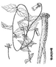 本种与前三种的区别在于:茎不缠绕,多攀援或蔓生状。叶柄较短,长5mm以下。花萼贴生于子房中部,裂片阔卵形,长1.2mm,宽约8mm,长不及花冠的一半;花冠管状;花丝被毛,花药龙骨状。花、果期7-10月。