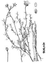 本种与前五种的区别在于:茎长25-85cm。分枝多,近木质。植株密被白毛,使植株呈灰色。叶在主茎上互生,在侧枝上近于对生,叶片较小,长宽可达1.5cm×1cm以下。花萼外面密被白色长硬毛;花冠长一般不超过2cm。花、果期7-10月。