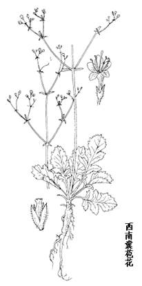 西南囊苞花属柔弱多年生直立草本,高15-30(-40)cm。根茎细长,四棱形,具2-6节,节间长0.5-2cm,节上生不定根。主根常为2枝并列,稍肉质,近纺锤形,长3-15cm,径2-3mm,棕褐色。茎方形,有沟,近光滑或微被疏柔毛。叶近基生,成假莲座状,3-6对叶生缩短节上,或在茎下部松散排列,连柄长3-8cm;叶片倒卵状披针形,二至四回羽状中裂,中央裂片较大,两侧裂片渐小,边缘有不整齐浅裂或锯齿,基部渐狭成长1-3cm的柄;上面深绿色,被稀疏白色渐脱毛,下面苍绿色,沿脉上具疏柔毛;茎上部叶渐小,浅裂,无柄。花在茎顶端成疏松窄长圆形聚伞圆锥花序;各分枝处有苞片1对,长2-4mm,具中脉1条,边缘疏生柔毛,花具短梗,果时长达1mm;小总苞4裂,裂片披针形,长1.5-2mm,外面密被紫色腺毛;萼筒壶状,长约1.5mm,具8条肋棱,先端收缩成8个微小的牙齿状或锯齿状的檐部;花冠白色或粉红色,长3-4(-5)mm,短漏斗状,5裂,裂片先端钝,近辐射对称;雄蕊4,略外伸,花药内向,白色,花丝直立,长5mm,着生于花冠近口部;花柱略长于雄蕊,长2mm,直伸,子房包于囊状小总苞内(囊苞)。瘦果包于囊苞中;果时囊苞长3-4mm,外被腺毛,4裂,裂片先端长渐尖,多曲钩。花、果期7-10月。