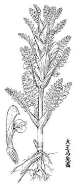大王马先蒿属多年生草本,高10-90cm。主根粗壮,根颈上生有丛密细根。茎直立,有棱角和条纹,有毛或无毛;枝轮生。叶3-5枚轮生;较上部的叶柄膨大互相结合成斗状;叶片长3.5-12cm,宽1-4cm,羽状全裂或深裂,裂片线状长圆形状至长圆形,宽4-8mm,边缘有锯齿。总状花序;苞片基部均膨大而结合成斗状,前半部羽状浅裂;花无梗;萼长约1cm,膜质,无毛,齿退化成2枚,宽而圆钝;花冠黄色,长约3cm,直立,管长2-2.5cm,在萼内微弯曲使花前俯,盔背部有毛,先端下缘有细齿一对,下唇以锐角开展,中裂小;雄蕊花丝2对均被毛;花柱伸出于盔端。蒴果卵圆形,先端有短喙,长1-1.5cm。种子长约3mm,具浅蜂窝状孔纹。花期6-8月,果期8-9月。
