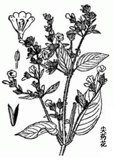 尖药花属多年生草本,高达1m。植株各部多少被灰白色绵毛。叶对生;具柄;叶片椭圆形至椭圆状长圆形,长5-12mm,先端尖,基部近圆形至心形,边圆具钝齿。花3-8朵成一簇,有间距地生于圆锥花序的分枝上,圆锥花序长达30cm;苞片、小苞片和花萼裂片均条形,长约7mm;花冠淡紫色,长约2.5cm,漏斗状钟形,外面无毛,里面近喉部有2行柔毛,裂片5,近相等;雄蕊二强,花丝基部有膜相连,2短雄蕊之间有一退化雄蕊残迹,花药药隔顶端有小尖头。蒴果长约1cm,有微毛。有种子6颗。