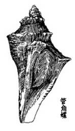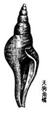 2、天狗角螺的贝壳长纺锤形,质坚厚,一般高220-305mm,宽95-110mm,螺层约9层,缝合线明显,自上而下逐渐增宽。螺旋部短,约为壳高的1/3。每一螺层中部扩张,略呈圆形隆起,肩部有较弱的结节。体螺层中部膨大,前端比管角螺更为狭长。壳面具有粗细相间的螺肋,并被有带细茸毛的黄褐色壳皮,茸毛脱落后露出淡肉色的壳面。壳口比前种更狭长,壳内面为淡肉红色,外唇稍厚,边缘完整;内唇薄,贴附于体螺层上,无脐。前沟形成细长的水管沟。厣角质,梨形,棕黑色。较粗糙,有皱褶。 |