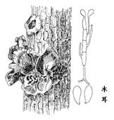 子实体丛生,常覆瓦状叠生。耳状、叶状或近杯状,边缘波状,薄,宽2-6cm,最大者可达12cm,厚2mm左右,以侧生的短柄或狭细的基部固着于基质上。初期为柔软的胶质,粘而富弹性,以后稍带软骨质,干后强烈收缩,变为黑色硬而脆的角质至近革质。背面外面呈弧形,紫褐色至暗青灰色,疏生短绒毛。绒毛基部褐色,向上渐尖,尖端几无色,(115-135)μm×(5-6)μm。里面凹入,平滑或稍有脉状皱纹,黑褐色至褐色。菌肉由有锁状联合的菌丝组成,粗约2-3.5μm。子实层生于里面,由担子、担孢子及侧丝组成。担子长60-70μm,粗约6μm,横隔明显。孢子肾形,无色,(9-15)μm×(4-7)μm;分生孢子近球形至卵形,(11-15)μm×(4-7)μm,无色,常生于子实层表面。