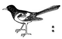 鹊鸲的雄鸟上体自额至尾上复羽概金属蓝黑色。中央2对尾羽染黑若漆;次1对白,而内缘除先端外,均为黑色;其余尾羽纯白。两翅大都黑褐,其中部纵贯以1道宽阔白斑,自翼角的小复羽直伸至内侧的次级复羽以及居中次级飞羽的外缘,飞时特著。下体自颏至胸蓝黑色,胸以下纯白,两胁略沾灰色;腋羽和翼下复羽白,而缀以灰褐色斑。雌鸟上体呈黑灰色,背部稍带蓝彩,但却无金属闪亮,其他羽色暗淡。虹膜褐色;嘴黑色,脚铅黑褐灰色。