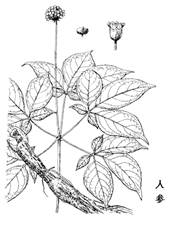 人参属多年生草本,高30-70cm。根肥大,肉质,圆柱形或纺锤形,末端多分歧,外皮淡黄色。叶为掌状复叶,具长柄;轮生叶的数目依生长年限而不同,一般1年生者1片三出 复叶,2年生者1片五出复叶,3年生者2片五出复叶,以后每年递增1片复叶,最多可达6片复叶;小叶5,偶有7片;小叶柄长1-3cm;小叶片披针形或卵形,下方2片小叶较小,长2-4cm,宽1-1.5cm,上部3小叶长4.5-15cm,宽2.2-4cm,先端渐尖,基部楔形,边缘具细锯齿,上面绿色,沿叶脉有稀疏细刚毛,下面无毛。伞形花序单一顶生,总花梗长15-25cm,每花序有10-80多朵花,集成圆球形;花小,直径2-3mm;花萼绿色,5齿裂;花瓣5,淡黄绿色,卵形;雄蕊5,花丝甚短;子房下位,花柱2,基部合生,上部分离。果实为核果状浆果,扁球形,直径5-9mm,多数,集成头状,成熟时呈鲜红色,种子2颗,乳白色,直径4-5mm,扁平圆卵形,一侧平截。花期5-6月,果期6-9月。