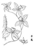 羊乳属多年生缠绕草本,长达2m以上。全株无毛,富含白色乳汁,具特殊腥臭气味;有多数短分枝。根粗壮肥大,纺锤形或近圆锥形,外皮粗糙,灰棕色至土黄色,近上部有稀疏环纹。主茎上叶互生,披针形或菱状狭卵形,细小;在小枝顶端的叶通常2-4枚簇生,而近于对生或轮生状,叶柄短小;叶片菱状卵形、狭卵形或椭圆形,长3-10cm,宽1.3-4.5cm,通常全缘或有疏波状齿。花单生于或对生于小枝顶端,具短梗;萼5裂,裂片卵状披针形,长1.5-2cm,宽5-8mm,绿色;花冠宽钟形,直径约2cm,5裂,裂片先端反卷,黄绿色,内有紫褐色斑点;雄蕊5,花丝短粗;子房半下位,柱头3裂。蒴果扁圆锥形,有宿萼。种子有膜质翅。花、果期7-8月。