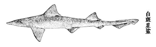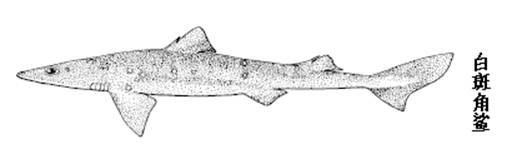 3、白斑角鲨 体较细长,体长1-1.5m。头宽扁而长,吻长,前缘窄尖。眼椭圆形,无瞬膜,鼻孔中等大,几平横,口浅弧形,近于横列,上唇褶宽扁,下唇褶较短。齿上下颌同型, 下颌齿稍宽。喷水孔肾形,颇大,鳃孔5个颇小。背鳍2个,各具1硬棘。第1背鳍起点与胸鳍里角相对或稍后,第2背鳍小,距腹鳍较近。臀鳍消失。胸鳍颇宽大,鳍端伸达第1背鳍硬棘下方。腹鳍近方形,位于两背鳍之间的后半部下方。尾鳍宽短,帚形,上叶发达,下叶后部无缺刻。体灰褐色,腹面白色,幼体背面及上侧面具圆形或长形白斑2纵行,随年龄增长而白斑减少,成体仅在上侧留存几个不显明白斑。各鳍暗褐色。 |