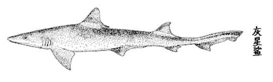 2、灰星鲨的体细而延长,体长1m左右。头平扁,吻中等长,背视近三角形。眼椭圆形。鼻孔宽大,前鼻瓣中部具一舌状突出,出水孔半露。口颇小,三角形,两侧斜行,前端圆钝,下颌稍短,口闭时上颌牙全露,下颌牙只在缝合处露出。上唇褶粗大而短,下唇褶细而较长,齿细小而多,铺石状排列。喷水孔小,横椭圆形,两端尖,位于眼角下后方。鳃孔5个,狭小,最后2个位于胸鳍基底上方。背鳍2个,第1背鳍颇大,较后位,上角圆钝,后缘凹入,下角延长尖突。第2背鳍稍小,上角钝圆,后缘深凹,下角延长尖突。尾鳍颇短狭,上叶颇发达,下叶前部稍突出,中部与后部间有一缺刻,尾端钝尖,后缘斜直。臀鳍小,后缘深凹,里角延长尖突。腹鳍比第2背鳍稍小,鳍脚平扁延长。胸鳍中等大。体背侧面灰褐色,腹面白色,各鳍紫褐色,后缘较浅淡,体无白色斑点。