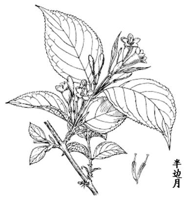 半边月是落叶灌木,高达6m。叶对生;叶柄长0.5-1.5cm,有毛;叶长卵形至卵状椭圆形,稀倒卵形,长5-15cm,宽3-8cm,先端渐尖至长渐尖,基部宽楔形至圆形,边缘具锯齿,上面深绿色,疏生短柔毛,脉上毛较密,下面浅绿色,密被短柔毛。单花或具3朵花的聚伞花序,生于短枝的叶腋或顶端;萼筒长10-12mm,裂片5,条形,长5-10mm,被柔毛;花冠白色或淡红色,花开后逐渐变红色,漏斗状钟形,长2.5-3.5cm,通常有毛,筒基部呈狭筒形,中部以上突然扩大,裂片5;雄蕊5,着生近花冠中部,花丝白色,花药黄褐色;花柱细长,柱头盘形,伸出花冠外。蒴果长圆柱形,长1.5-2cm,先端有短柄状喙,疏生柔毛。种子具狭翅。花期4-6月,果期6-7月。