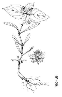 孩儿参属多年生草本,高15-20cm。地下有肉质直生纺锤形块根,四周疏生须根。茎单一,不分枝,下部带紫色,近方形,上部绿色,圆柱形,有明显膨大的节,光滑无毛。单叶对生;茎下部的叶最小,倒披针形,先端尖,基部渐窄成柄,全缘,向上渐大,在茎顶的叶最大,通常两对密接成4叶轮生状,长卵形或卵状披针形,长4-9cm,宽2-4.5cm,先端渐尖,基部狭窄成柄,叶背脉上有疏毛,边缘略呈波状。花二型:近地面的花小,为闭锁花,花梗紫色有短柔毛,萼片4,背面紫色,边缘白色而呈薄膜质,无花瓣;茎顶上的花较大而开放,花梗细,长1-2(-4)cm,有短柔毛,花时直立,花后下垂,萼片5,披针形,绿色,背面及边缘有长毛;花瓣5,白色,先端呈浅齿状2裂或钝;雄蕊10;子房卵形,花柱3。蒴果近球形。有少数种子,种子褐色,扁圆形或长圆状肾形,有疣状突起。花期4月,果期5-6月。