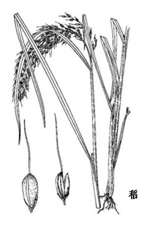 稻是一年生栽培植物。秆直立,丛生,高约1m左右。叶鞘无毛,下部者长于节间;叶舌膜质而较硬,披针形,基部两侧下延与叶鞘边缘相结合,长5-25mm,幼时具明显的叶耳;叶片扁平,披针形至条状披针形,长30-60cm,宽6-15cm。圆锥花序疏松,成熟时向下弯曲,分枝具角棱,常粗糙;小穗长圆形,两侧压扁,长6-8mm,含3小花,下方两小花退化仅存极小的外稃而位于1两性小花之下;颖极退化,在小穗柄之顶端呈半月形的痕迹;退化外稃长3-4mm,两性小花外稃,有5脉,常具细毛,有芒或无芒,内稃3脉,亦被细毛;鳞被2,卵圆形,长1mm;雄蕊6;花药长2mm;花柱2枚,筒短,柱头帚刷状,自小花两侧伸出。颖果平滑。花、果期6-10月。