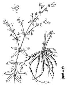 化合物成分:2-甲基-1,3,6-三羟基-9,10-蒽醌-3-O-(6′-O-乙酰基)-α-L-鼠李糖基(1→2)-β-D-葡萄糖甙[2-methyl-1,3,6-trihydroxy-9,10-anthraquinone-3-O-(6′-O-acetyl)-α-L-rhamnosyl(1→2)-β-D-glucoside],2-甲基-1,3,6-三羟基-9,10-蒽醌-3-O-α-L-鼠李糖基(1→2)-β-D-葡萄糖甙[2-methyl-1,3,6-trihy-droxy-9,10-anthraquinone-3-O-α-L-rhamnosyl(1→2)-β-D-gluco-side],2-甲基-1,6-二羟基蒽醌-3-O-(6′-O-乙酰基)-α-L-吡喃鼠李糖基(1→2)-β-D-吡喃葡萄糖甙[2-methyl-1,6-dihydroxyanthraquinone-3-O-(6′-O-acetyl)-α-L-rhamnopyranosyl-(1→2)-β-D-glucopyranoside],2-甲基-1,6-二羟基蒽醌-3-O-α-L-吡喃鼠李糖基(1→2)-β-D-吡喃葡萄糖甙[2-methyl-1,6-dihydroxyanthraquinone-3-O-α-L-rhamnopyranosyl-(1→2)-β-D-glucopyranosi-de],茜根酸(ruberythric acid),茜草乔木醇(rubiarbonol)A?G,茜草乔木酮(rubiarbonone)A?环己肽甙(glycocyclohexapeptide)RY-1及其甙元RA-Ⅴ?