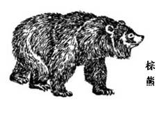 2.棕熊的体形较大,长约2m,重200-300kg。头阔而圆,吻部较长,鼻也较阔,其端裸出,略侧扁。耳小,能动,内外被毛。肩端隆起,腰粗壮,尾短。四肢粗壮,前后足均具5趾,前足的爪长于后足。爪侧扁而弯曲,呈暗褐色。全身为黑棕色,或近黑色以至很淡的银灰色、棕黄色或棕红色。成体胸部无白色斑纹。