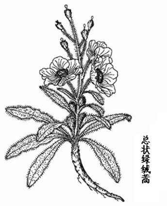 总状绿绒蒿属一年生草本,高约40cm。全株被黄褐色或淡黄色坚硬而平展的刺毛,有时刺毛的基部呈紫色。主根长达20cm。茎圆柱形,不分枝。基生叶和茎下部叶具柄,长3-8cm;叶片长圆状披针形、披针形至条形,长5-20cm,宽0.7-4.2cm,先端急尖或钝,基部狭楔形,下延至叶柄基部近鞘状,全缘或波状,稀具不规则的粗锯齿,两面绿色,被刺毛;上部茎生叶具短柄至无柄,叶片长圆状披针形,有时条形。花生于茎上部1/3以上的叶腋内,最上部者无苞片,有时生于混生的花葶上;花梗长2-5cm;萼片长圆状卵形,外面被刺毛;花瓣5-8,倒卵状长圆形,长2-3cm,宽1-2cm,天蓝色或蓝紫色,有时红色,无毛;雄蕊多数,花丝丝状,紫色,花药长圆形,黄色;子房卵形,4-6心皮,密被刺毛,花柱圆锥形,具棱,无毛,柱头长圆形。蒴果卵形或长卵形,密被刺毛,4-6瓣自先端开裂至全长的1/3处,宿存花柱长0.7-1cm。种子长圆形,表面具窗格状网纹,花托膨大成盘状。花期5-8月,果期7-11月。 |