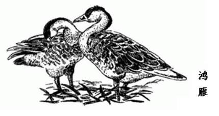 2.鸿雁的雄鸟成体长约90cm,雌鸟较雄鸟为小,雌雄羽毛相似。嘴裂基部有2条黑褐色颚纹,颏及喉棕红。头顶至枕部为棕褐色,向后渐深。颈部除正中呈棕褐色外,余均白色。背、肩、三级飞羽暗褐色,羽缘淡棕色;初级飞羽灰褐,端部转黑褐;次级飞羽浓褐;翅上覆羽灰褐,羽缘棕白以至白色。下背和腰黑褐色。前颈下部和胸部均淡肉红色,向后渐淡至下腹转为纯白色。胁部暗褐,羽缘棕白。翅下覆羽及腋羽暗灰。尾羽暗褐色,尾上覆羽前褐后白,尾下覆羽和尾侧覆羽纯白。嘴黑色,雄雁的上嘴基部有一瘤状突。虹膜赤褐色或褐色,趾蹠橙黄色,爪黑色。